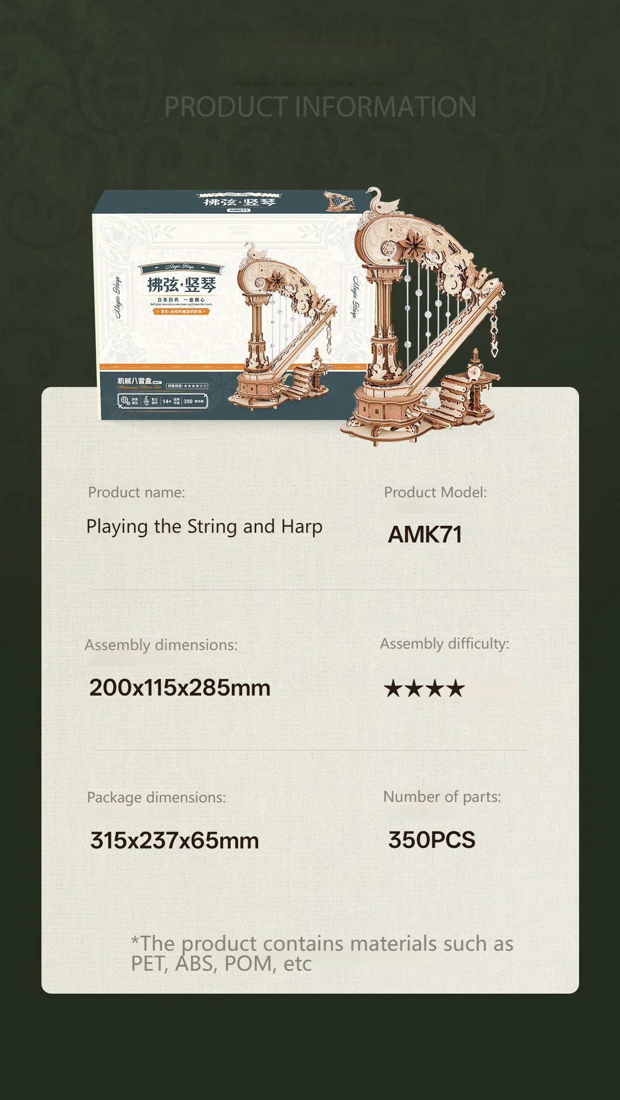 [SELF-PLUCKING STRINGS] Stringed Harp Christmas Music Box model kit is driven entirely by gear transmission (no batteries required). Simply wind up the spring-key behind the harp fully, and its strings will be automatically plucked to play a beautiful tune for the audience.