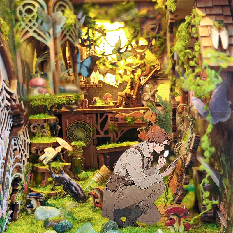 DIY Book Nook Insert Shelf Kits Wooden Miniature Building Kit The Records of Insects Bookend Bookshelf Home Decoration - Model to assemble