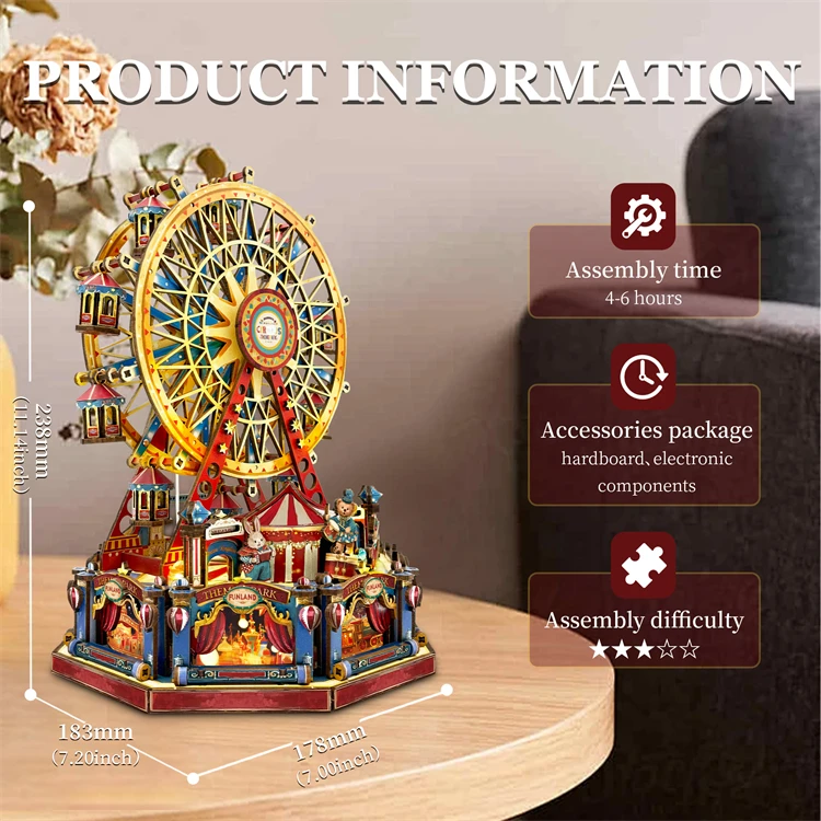 The DIY Ferris Wheel music box is not just a model; it’s a canvas for your creativity. You can design and customize each piece, turning a simple kit into a unique masterpiece. Whether you are an experienced hobbyist or a beginner, this project offers an engaging way to spend your time. Therefore, because of its ease of assembly, you will enjoy every moment as you bring this delightful Ferris Wheel to life.