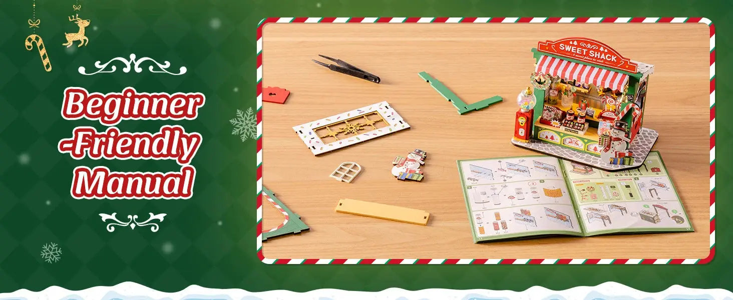 As you piece together each part, imagine stepping into a charming “Sweet Shack” candy shop on a snowy Christmas Eve. A cheerful snowman clutches his gifts, jars overflow with colorful treats, and the striped awning dances gently in the winter breeze. When completed, the warm glow of twinkling lights and the cozy holiday details will transport you to a world filled with laughter, the rustle of wrapping paper, and the irresistible scent of candy in the air.